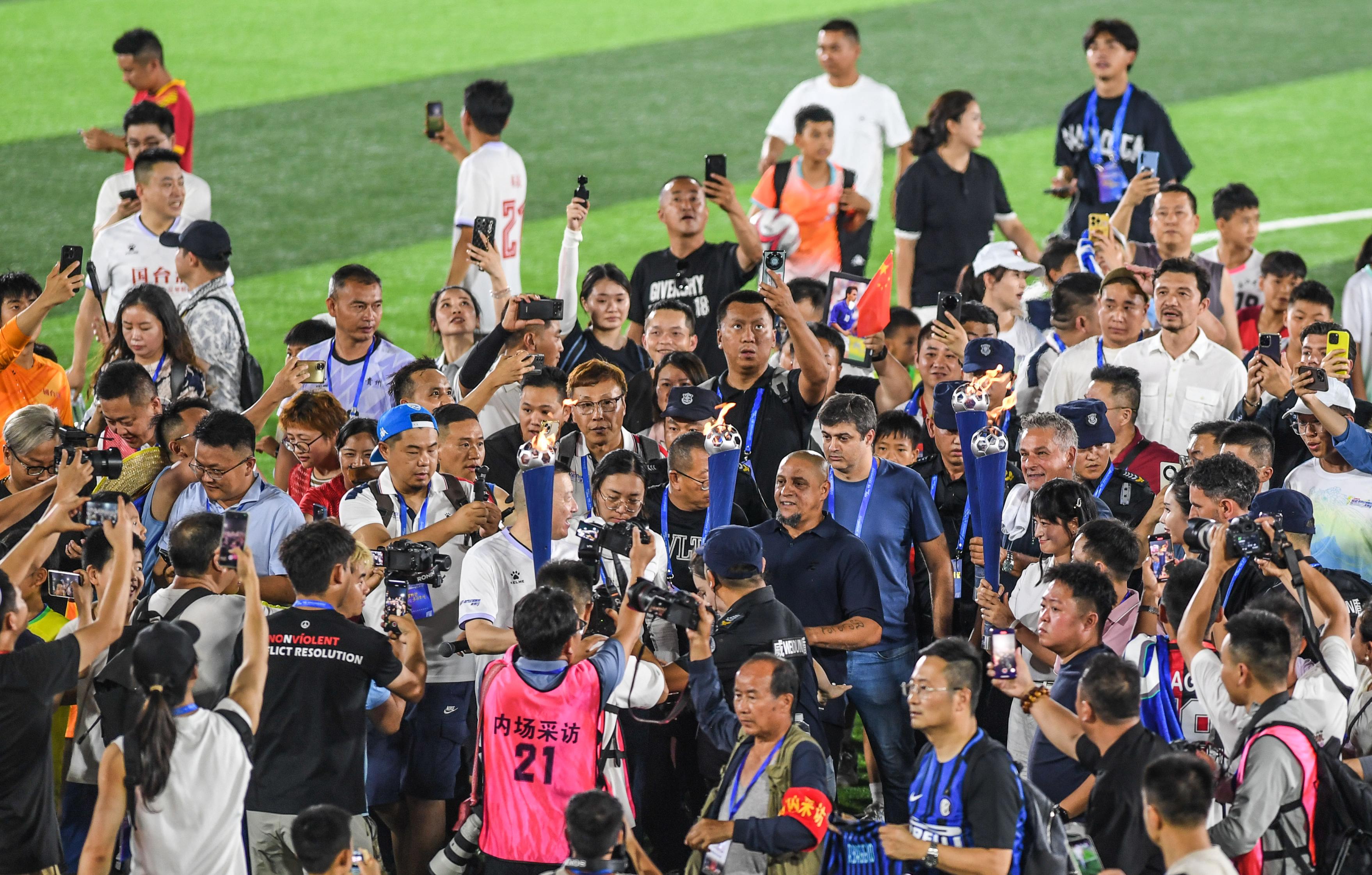 7月26日,人们在榕江“村超”球场拍摄巴乔与卡洛斯参加的“世界足球明星贵州行”启动仪式。新华社记者 杨文斌 摄
